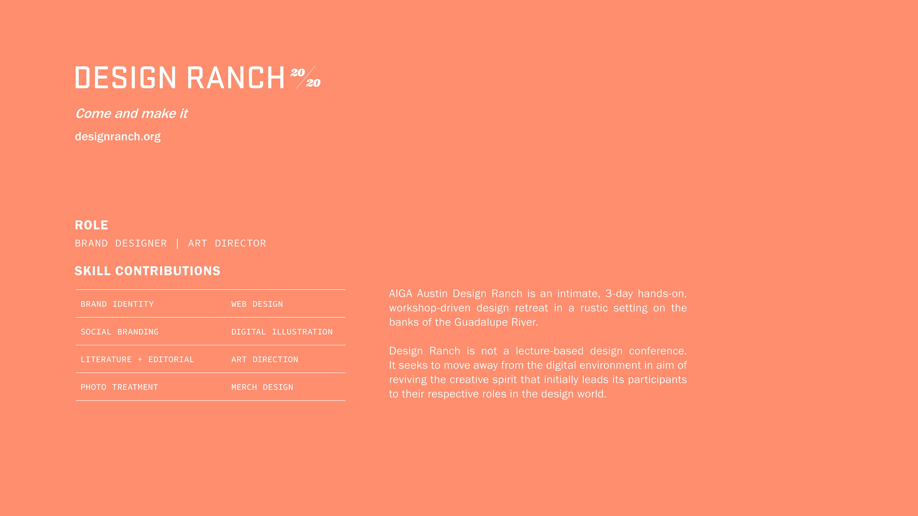 The AIGA Design Ranch 2020 identity system is rooted in a deliberate juxtaposition of the rustic and the refined; the pencil rendering of two squares connected by meandering strokes in contrast to the mathematical exactitude of a vector cube. My goal was to push as far away from expected bucolic imagery and Texas trappings as possible, without misrepresenting the event. The end result pays homage to the rudimentary delights of nature and craft, while playfully honoring those who come together in the workshops – Professional designers.